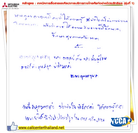 Thailand Call Center Academy (TCCA) ได้รับเกียรติและได้รับความไว้วางใจจาก บริษัท มิตซูบิชิ อีเล็คทริค กันยงวัฒนา จำกัด ให้ดำเนินการฝึกอบรมแก่ทีมบริการ ในหลักสูตร เทคนิคการสื่อสารและศิลปะการบริการอย่างมีประสิทธิผล Effective Communication Technique & Positive Thinking โดยเน้นการสื่อสาร กับเพื่อนพนักงานภายในองค์กร เพื่อการส่งต่อ ประสานงาน ติดตามงานที่ราบรื่น สร้างความเข้าใจ ขจัดความขัดแย้งอย่างมีประสิทธิผล จำนวน 2 รุ่น โดยมี อ.ต้น สรวิทย์ บัวศรี เป็นวิทยากรถ่ายทอดเทคนิคการสื่อสารทางโทรศัพท์ การสื่อสารเพื่อการทำงานอย่างมีประสิทธิภาพ ที่เปี่ยมสุขไปด้วยเทคนิค การฝึกปฏิบัติทุกขณะของการอบรม วิธีการพูด รอยยิ้ม ความสุข สนุกสนาน อิ่มเอม อบอุ่น เป็นกันเอง ปรับปรุง แก้ไข ทักษะทางด้านต่างๆ ทางด้านการรับโทรศัพท์ พร้อมด้วย Case ต่างๆ มากมาย โดยเน้นคุณภาพ ที่นำไปสู่การยกระดับการบริการที่เป็นเลิศ อย่างเห็นผลชัดเจนภายหลังจากการอบรม