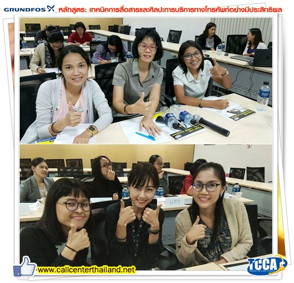 Thailand Call Center Academy (TCCA) ได้รับเกียรติและได้รับความไว้วางใจจาก บริษัท กรุนด์ฟอส (ประเทศไทย) จำกัด ให้ดำเนินการฝึกอบรมแก่ทีมบริการ ในหลักสูตร เทคนิคการสื่อสารและศิลปะการบริการอย่างมีประสิทธิผล Effective Communication Technique & Positive Thinking เมื่อวันพฤหัสบดีที่ 7 กันยายน 2560 โดยมี อ.ต้น สรวิทย์ บัวศรี เป็นวิทยากรถ่ายทอดเทคนิคการสื่อสาร ประสานงานทางโทรศัพท์ เพื่อมุ่งสู่การบริการที่เป็นเลิศ ที่เปี่ยมสุขไปด้วยทคนิค การฝึกปฏิบัติทุกขณะของการอบรม วิธีการพูด รอยยิ้ม ความสุข สนุกสนาน อิ่มเอม อบอุ่น