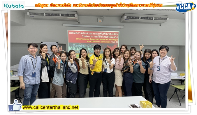 Thailand Call Center Academy (TCCA) ได้รับเกียรติและได้รับความไว้วางใจจาก บริษัท สยามคูโบต้าคอร์ปอเรชั่น จำกัด ในการจัดฝึกอบรม In-house Training : หลักสูตร เทคนิคการสื่อสารประสานงานและการรับเรื่องร้องเรียนของลูกค้าขั้นวิกฤติ ในสภาวการณ์ที่ยุ่งยาก เมื่อวันที่ 18 มีนาคม 2567 โดยมี อ.ต้น สรวิทย์ บัวศรี เป็นวิทยากรถ่ายทอดเทคนิควิธีการสื่อสาร เทคนิคการรับมือ และวิธีการประสานงาน การรับเรื่องทางโทรศัพท์ ที่เปี่ยมสุขไปด้วยความรู้ใหม่ๆ รอยยิ้ม เสียงหัวเราะ ความสนุกสนาน ความอบอุ่น และเป็นกันเอง เน้นการฝึกปฎิบัติในขณะอบรม เพื่อเพิ่มประสิทธิภาพในงานบริการ Call Center อย่างเห็นผลชัดเจน