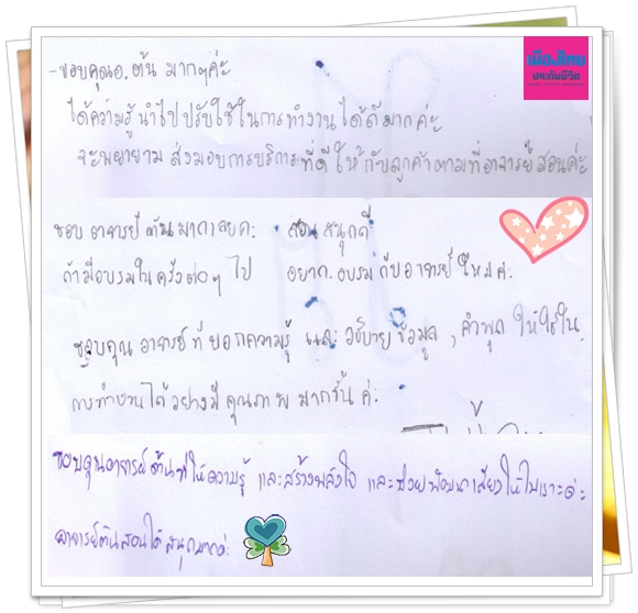 • เน้นปฏิบัติมากกว่าทฤษฎี ในขณะอบรม เพื่อเพิ่มประสิทธิภาพในงานบริการ อย่างเห็นผลชัดเจน