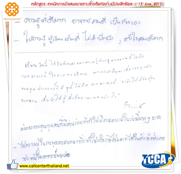 Thailand Call Center Academy (TCCA) ได้รับเกียรติและได้รับความไว้วางใจจาก บริษัท Wellness Mark จำกัด ให้ดำเนินการอบรม หลักสูตร Telesales เทคนิคการเสนอขายทางโทรศัพท์อย่างมีประสิทธิผล (Professional Telesales - Outbound Call) แก่เจ้าหน้าที่ Outbound Call ซึ่งเป็นหลักสูตรอบรมที่เน้นเทคนิคเปิดและปิดการขายที่หลากหลาย พร้อมกลยุทธ์ต่างๆ ให้ประสบผลสำเร็จ มุ่งสูงยอดขายให้ทะลุเป้า ณ ห้องอบรม เมื่อวันเสาร์ที่ 13 มิถุนายน 2558 โดยมี อ.ต้น สรวิทย์ บัวศรี เป็นวิทยากรถ่ายทอดความรู้ ประสบการณ์จริงที่ไม่มีในตำรา ฝึกปฏิบัติ พร้อมเสริมเทคนิคการขายแบบใหม่ๆ ในรูปแบบการสื่อสารที่โดนใจ และเทคนิคการปิดการขายเพื่อตอบสนองความต้องการ อย่างมีประสิทธิผล พร้อมเทคนิคการโน้มน้าว การสร้างความประทับใจแก่ลูกค้า เน้น Wokshop & Role Play & ระดมสมอง เติมเต็มความมั่นใจในการขาย ให้สำเร็จตามเป้า ท่ามกลางรอยยิ้ม ความสนุกสนาน ความอบอุ่น ด้วยบรรยากาศแบบสบายๆ เป็นกันเอง ได้ปรับปรุงทักษะทางด้านการพูดที่เป็น Magic Words ตลอดการอบรม มี Case Study ที่ดีมากๆ โดยเน้นผลการอบรมที่สามารถนำกลับไปใช้ปฏิบัติงานได้ทันที