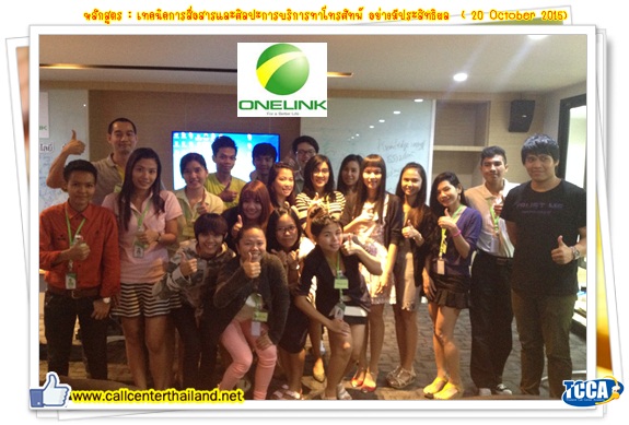 Thailand Call Center Academy (TCCA) ได้รับเกียรติและไว้วางใจจาก บริษัท วันลิ้งค์ เทคโนโลยี่ จำกัด ผู้ให้บริการติดตามและบริหารยานพาหนะผ่านดาวเทียมจีพีเอส GPS ให้ดำเนินการฝึกอบรมแก่ทีมบริการ ในหลักสูตร เทคนิคการสื่อสารและศิลปะการบริการอย่างมีประสิทธิผล Effective Communication Technique & Positive Thinking เมื่อวันอังคารที่ 21 และ 27 ตุลาคม 2558 อย่างต่อเนื่อง ณ ห้องอบรมบริษัท OneLink โดยมี อ.ต้น สรวิทย์ บัวศรี