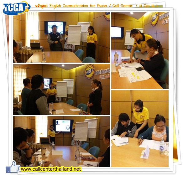Thailand Call Center Academy (TCCA) จัดฝึกอบรม Public Training ให้แก่ บริษัท ทิพยประกันภัย จำกัด, บริษัท ไทยคาร์ดิฟ ประกันชีวิต จำกัด (มหาชน), บริษัท True GS จำกัด ในหลักสูตร English Communication for Telephone/Call Center เมื่อวันเสาร์ที่ 31 ตุลาคม 2558 ณ โรงแรม Gold Orchid โดยมี Teacher Ricci วิทยากรคุณภาพ ระดับรางวัล Customer Satisfaction Award ชาวฟิลิปปินส์ที่มีประสบการณ์ตรงด้าน Call Center มาเป็นวิทยากรถ่ายทอด เทคนิคการพูดภาษาอังกฤษทางโทรศัพท์ที่ถูกต้อง ด้วยความกล้า และสุภาพยิ่งขึ้นกับชาวต่างชาติ รวมถึงทำ Workshop