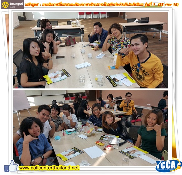 Thailand Call Center Academy (TCCA) ได้รับเกียรติและไว้วางใจจาก บริษัท กรุงศรี ออโต้ จำกัด ให้ดำเนินการฝึกอบรมแก่ทีมบริการ Call Center จำนวน 10 รุ่น ในหลักสูตร เทคนิคการสื่อสารและศิลปะการบริการอย่างมีประสิทธิผล Effective Communication Technique & Positive Thinking รุ่นที่ 1 เมื่อวันเสาร์ที่ 28 พฤศจิกายน 2558 ณ ห้องอบรม New Car โดยมี อ.ต้น สรวิทย์ บัวศรี